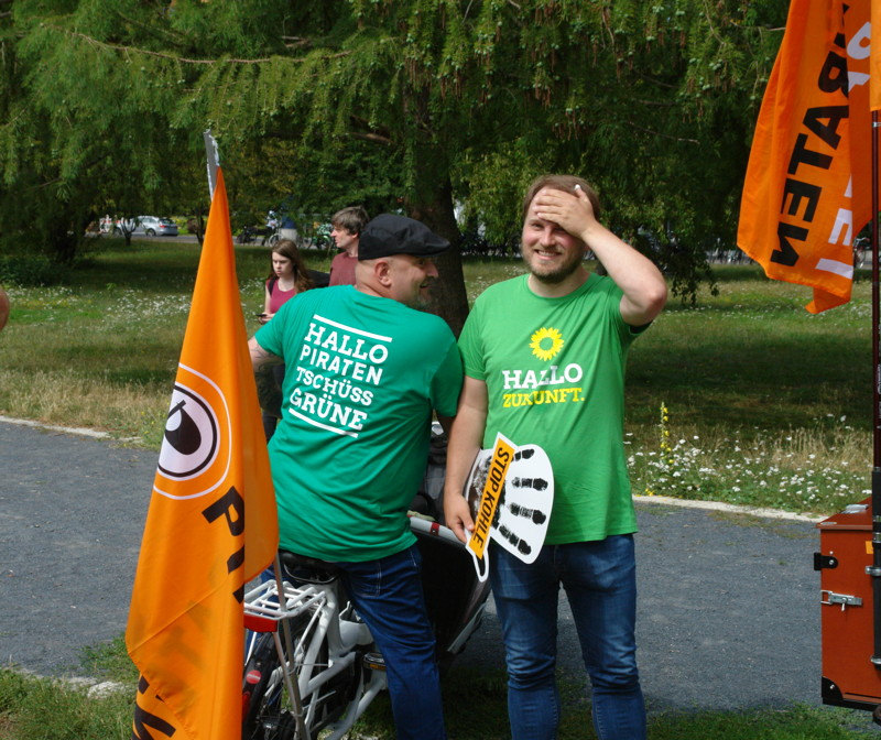 Die PIRATEN waren mit zwei Booten dabei. Die Peace war aus Berlin angereist, um auf dem Wasser teil zu nehmen und das bayerische Piratenboot, das momentan im Brandenburger Landtags-Wahlkampf hilft, an Land als Infostand am Ausgangspunkt der Demo.